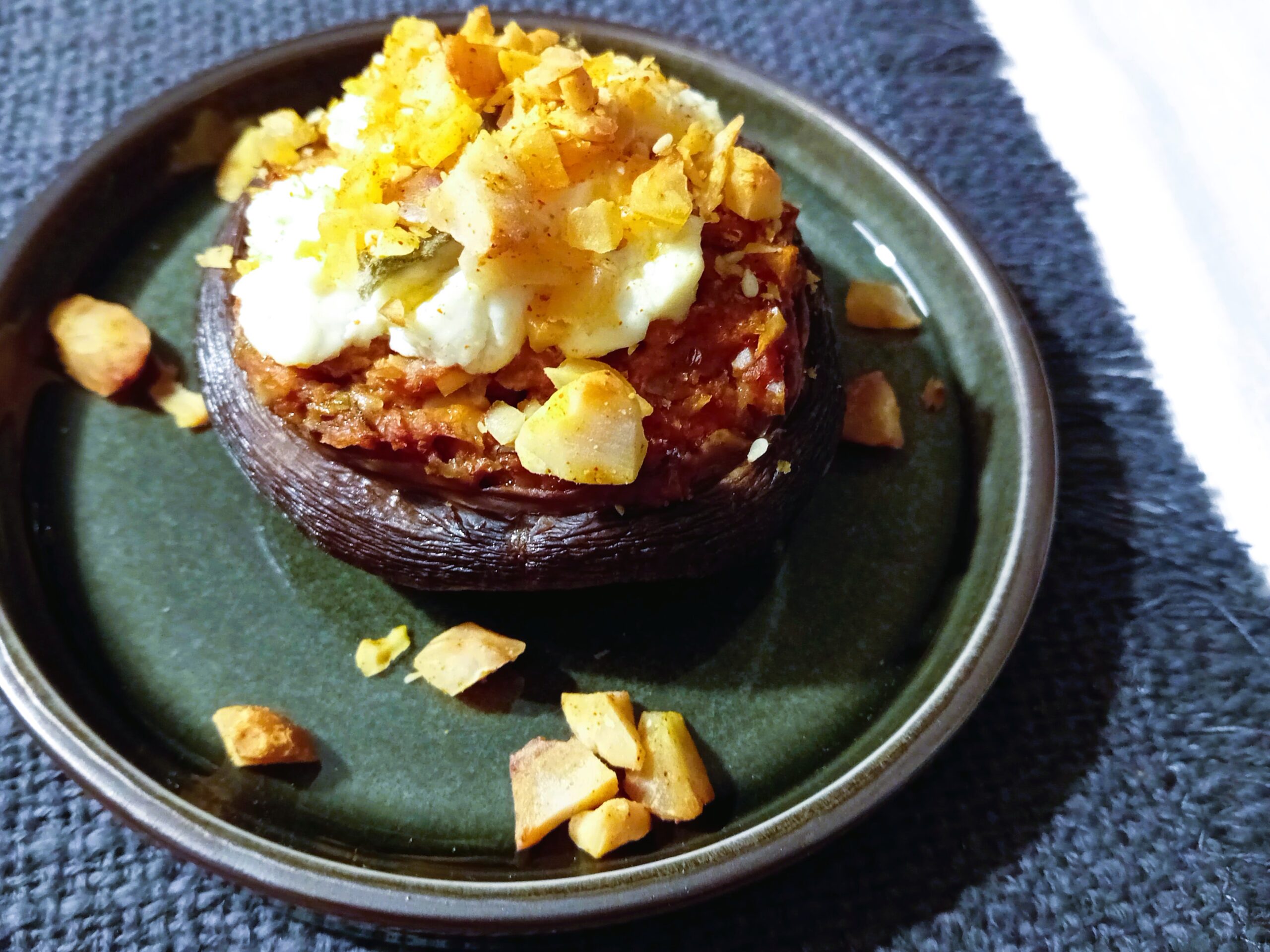 Portobello gevuld met ajvar (aubergine en paprika), walnoten en ricotta. Bestrooid met lichtgekruide en geroosterde noten en sesam.