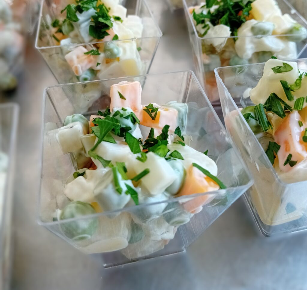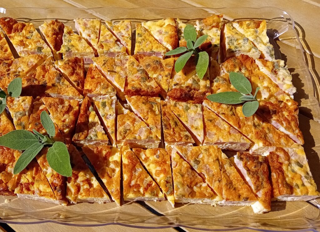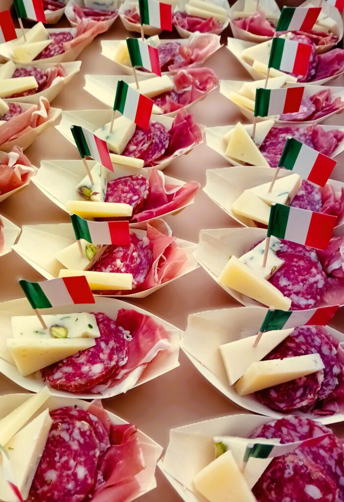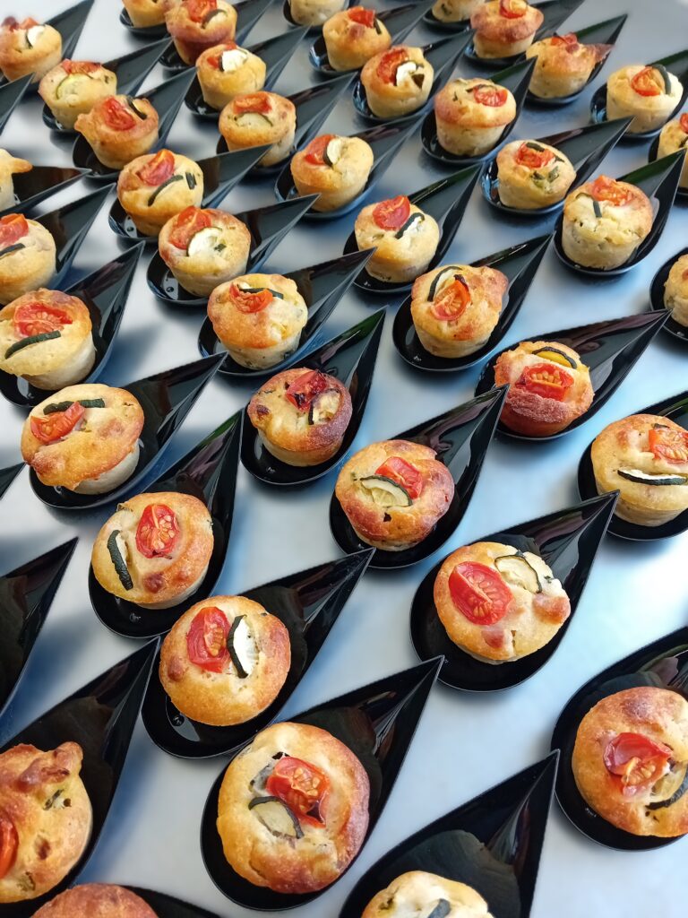 Op basis van de wensen van de klant samengesteld en bezorgd. Zoals een mini-antipasti-schaaltje, met o.a. San Daniele ham en Montasio kaas wat typische producten uit Friuli zijn, mini-muffins, baccalà mantecato op gegrilde polenta.